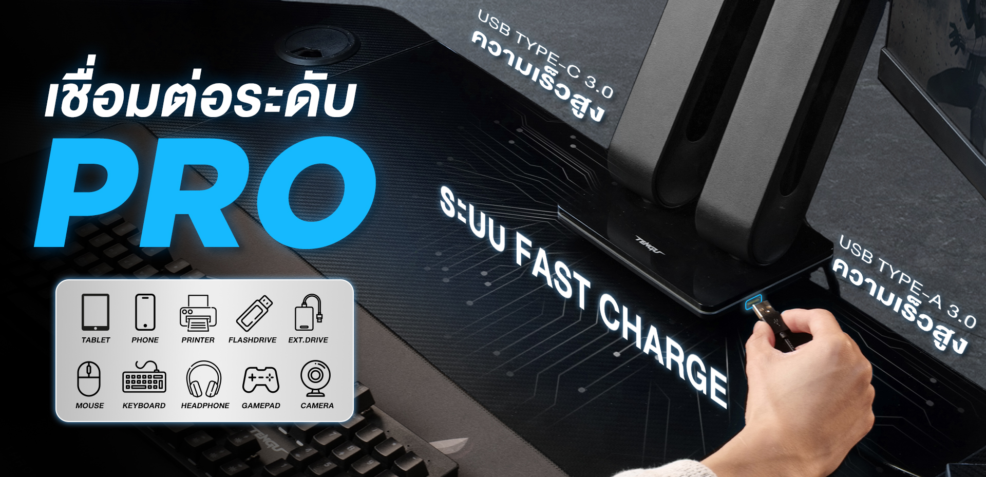Link ทุกฟังก์ชัน สู่ระดับ PRO การใช้งานที่ไร้รอยต่อ การเชื่อมต่อด้วย USB Hub 3.0 ที่ให้สปีดแบบเต็ม Max และเสถียร ด้วยการใช้สายเชื่อมต่อแยกพอร์ท วัสดุอลูมิเนียมหนาพิเศษ และดีไซน์ที่เท่ ดุดัน ระดับ PRO